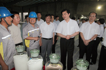 河南省商丘市委书记陶明伦(右二)、市长余学友(右三)观看宁陵公司生产的产品,左三为宁陵公司总经理王经明